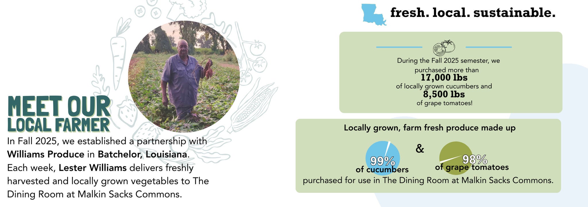 At Tulane Hospitality, we’re committed to making a positive impact on campus and the community by focusing on responsible sourcing, reducing food waste, and offering nutritious meals made with responsible practices. From supporting local partners to making thoughtful choices in our dining operations, we’re working every day to build a more sustainable future. And you can be a part of the effort, too!